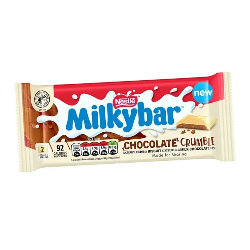 A shareable white-chocolate bar layered over a milk-chocolate base, with a crunchy, vanilla-biscuit crumble centre that delivers a rich combination of creamy sweetness and satisfying crunch. The contrast between the smooth chocolate coating and the crumbly biscuit core makes each bite feel indulgent yet textured — perfect for sharing or savouring solo.