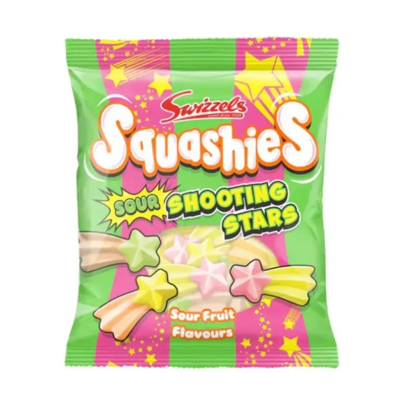 Star-shaped, soft-and-foamy gummy sweets bursting with bold, tangy fruit flavours — with a mix of pink lemonade, peach & starfruit, and cola & lime. Their squishy, “squashable” texture gives a chewy, playful mouthfeel, while the sour-fruit coating adds a refreshing zing, making them a fun, nostalgic treat for candy lovers.